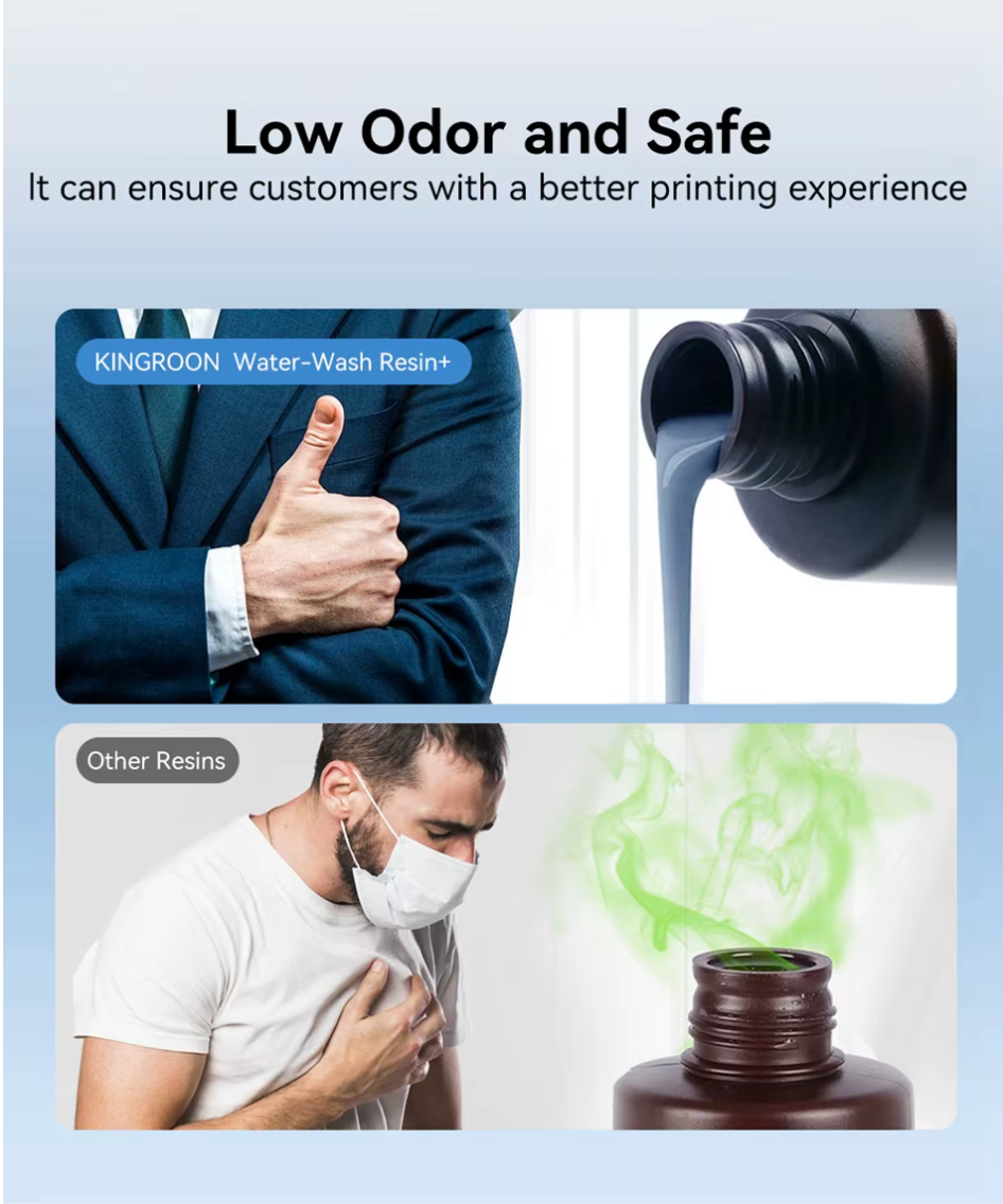 【Low odor and safe】water washable photopolymer resin has low odor and it can ensure customers with a better printing experience. Take a full shake before use in order to have a fully mix the functional components and fully mix the color paste in the resin. Otherwise, uneven coloring of the print may occur.
